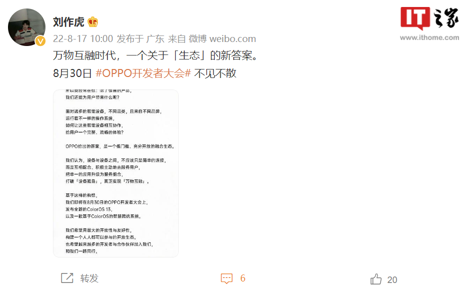 8 月 17 日消息,今日上午,OPPO 首席产品官、一加创始人刘作虎宣布 OPPO 开发者大会将于 8 月 30 日召开,并称将带来“万物互融时代,一个关于‘生态’的新答案”。