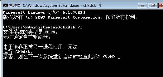 3、如下图所示,在这个界面中会出现“是否计划在下次系统重新启动时检查这个卷”,我们在这些文字的后面按照下图方式输入Y,然后重新启动计算机,计算机会进行自动的修复。