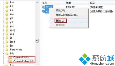 3、展开“.lnk”后,我们可以看到“openwithlist”和“openwithprogids”,分别将两个项里面的值全部删除即可;