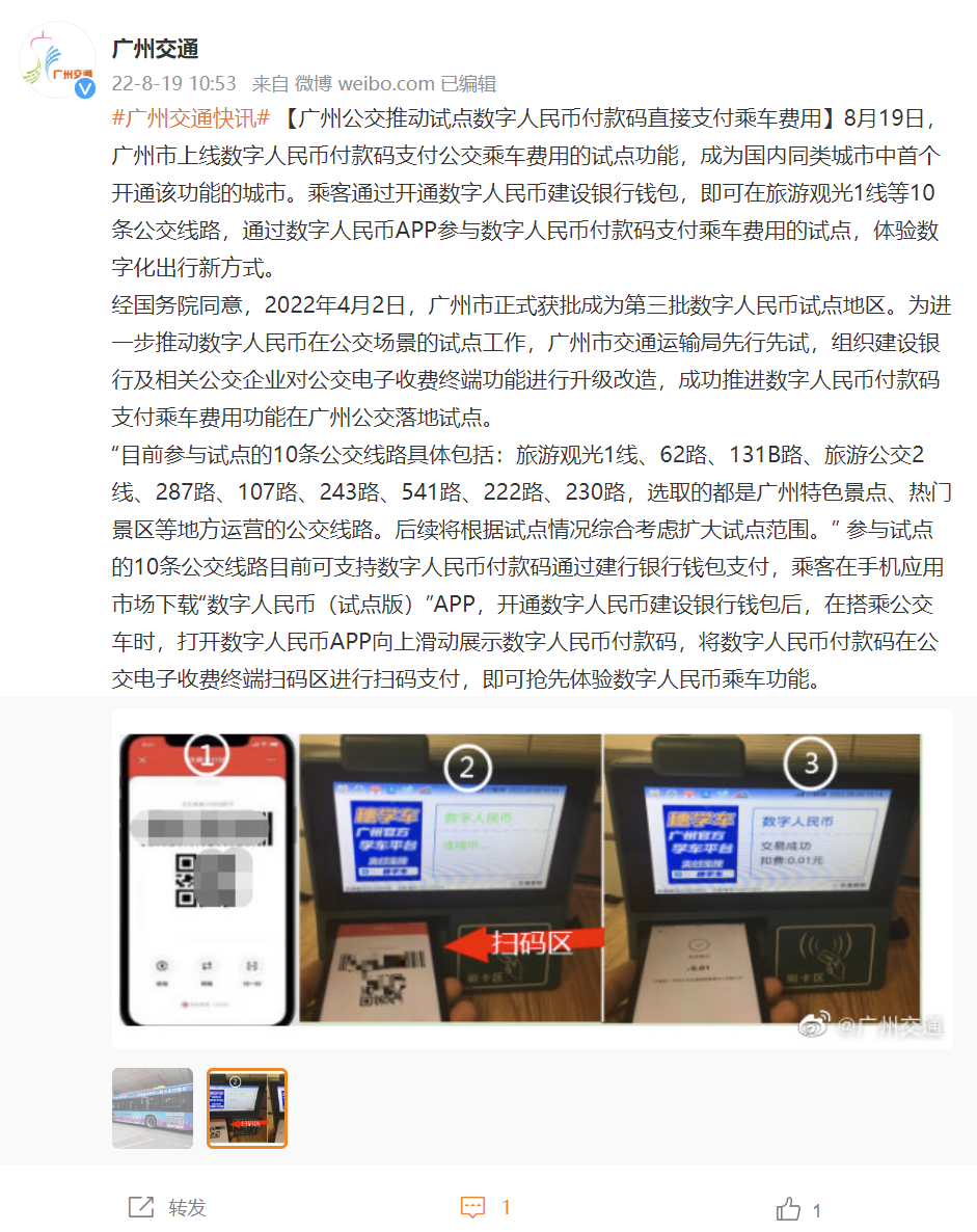 8 月 19 日消息,据广州市交通运输局官微,今日,广州市上线数字人民币付款码支付公交乘车费用的试点功能,成为国内同类城市中首个开通该功能的城市。