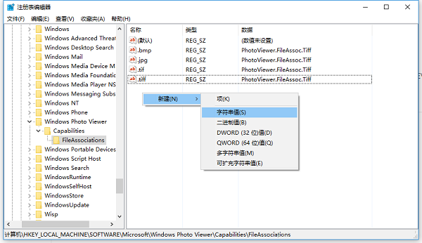 2、打开注册表编辑器之后,我们双击左侧的目录,依次打开 HKEY_LOCAL_MACHINESOFTWAREMicrosoftWindows Photo ViewerCapabilitiesFileAssociations目录项,直到看到该子目录下的一系列关键文件。