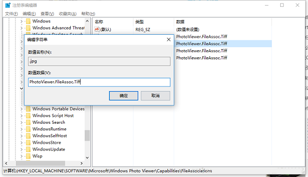 4、接下来就是比较关键的步骤了,如果你想要打开.jpg后缀的文件,那么数值名称要写为.jpg,数值数据写为“PhotoViewer.FileAssoc.Tiff”,如下图所示,然后点击“确定”按钮。