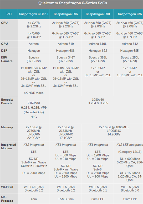 其它基本参数上,CPU部分仍基于ARM v8指令集开发,8核定制Kryo(4xA78+4xA55),最高频率2.2~2.3GHz,显示单元支持1080P分辨率120Hz屏幕,集成X62 5G基带(2.9 Gbps)、集成FastConnect 6700连接单元(蓝牙5.2+Wi-Fi 6E)等。