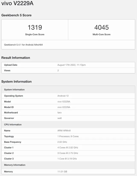 IT之家了解到,从 Geekbench 跑分网站曝光的信息来看,vivo X Fold+(V2229A)机型搭载 8 核处理器,包括一个 3.19GHz 的超大核、3 个 2.75GHz 的大核和 4 个 2.02GHz 的小核,这也意味着该机将搭载骁龙 8+ Gen1 处理器。