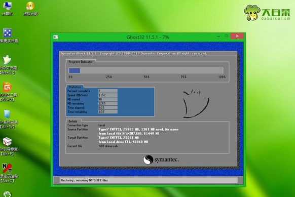 9、转到这个界面,执行win7系统安装到C盘的操作,这个过程需要5分钟左右;