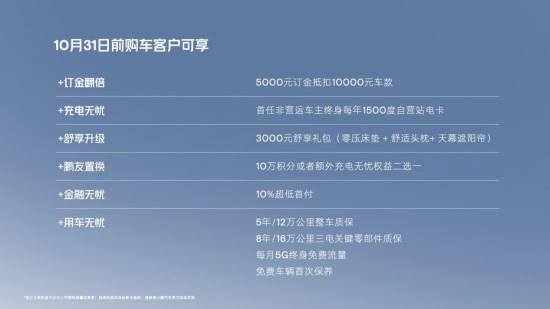 在购车权益方面,于2022年9月21日-2022年10月31日期间购买小鹏G9的用户,将享受5000元订金抵扣10000元车款、首任非营运车主终身每年1500度自营站电卡等权益(权益及活动参与规则,请参考小鹏汽车官方活动页面)。