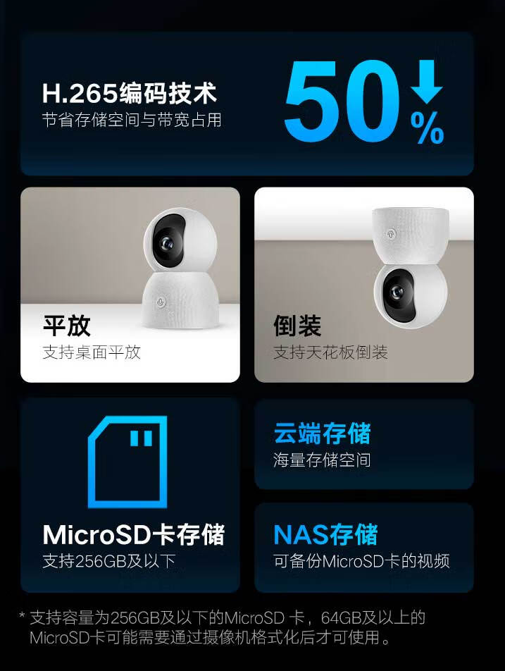 IT之家了解到,小米智能摄像机 2 AI 增强版支持 2.4GHz 和 5GHz 双频 WiFi 连接,支持 256GB 及以下 micro SD 卡进行存储。同时,小米智能摄像机 2 AI 增强版支持 H.265 编码技术,官方声称可节省 50% 存储与带宽占用。