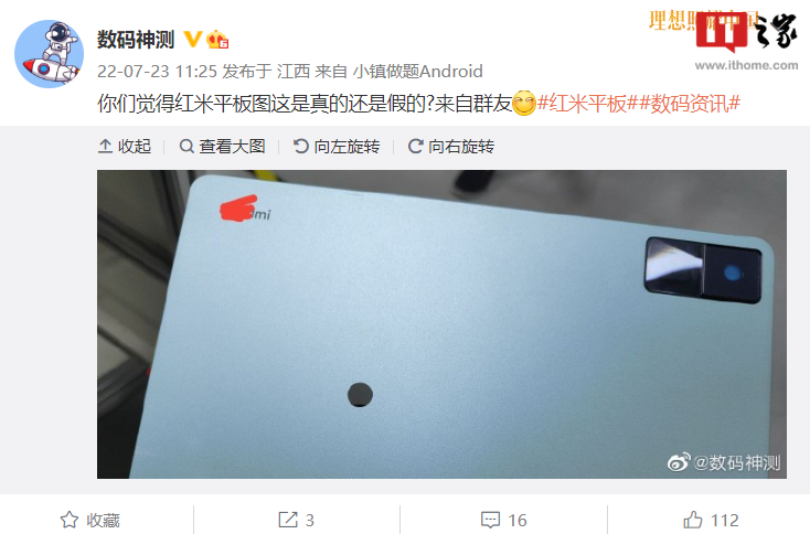博主 @数码神测 此前放出了一张疑似 Redmi Pad 平板的真机图,仅供参考。
