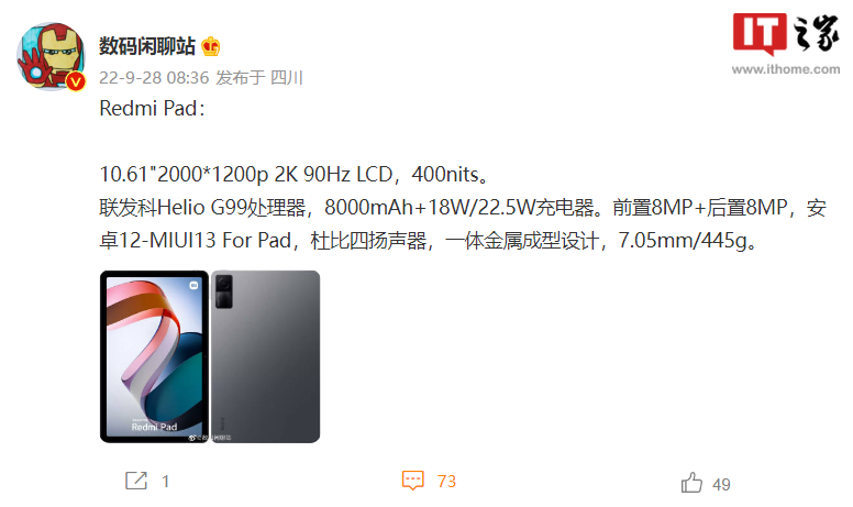 @数码闲聊站 透露,小米 Redmi Pad 搭载联发科 Helio G99 处理器,配备 10.61 英寸 2000*1200 90Hz LCD 屏,最高 400 尼特亮度,拥有 8000mAh 电池,配备 18W / 22.5W 充电器。