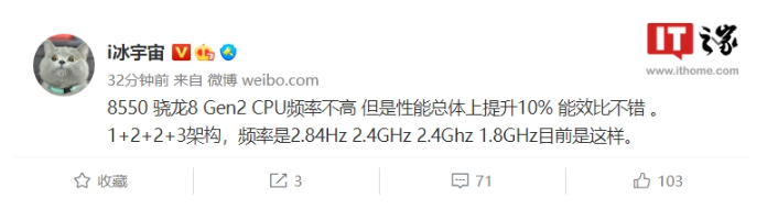 据微博博主 @i 冰宇宙 爆料称,高通骁龙 8 Gen 2 (SM8550 )芯片采用 1+2+2+3 架构,目前看到的 CPU 频率是 2.84Hz、2.4GHz、2.4Ghz 和 1.8GHz。该博主还透露,骁龙 8 Gen 2 性能总体上提升 10%,能效比不错。