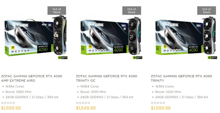 如上所示,索泰新款 RTX 4090 TRINITY 为英伟达的建议零售价 1600 美元,TRINITY OC 版本加价 50 美元,AMP EXTREME AIRO 旗舰型号加价 100 美元。