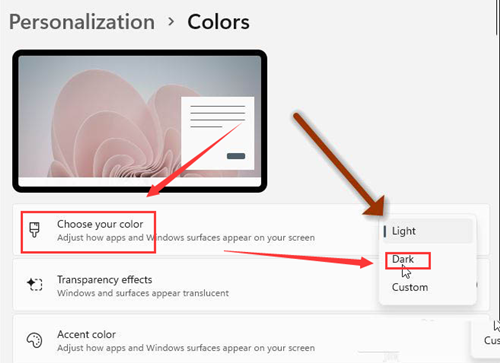 3、在选择颜色栏目中点击更改Dark选项,并保存设置即可开启黑暗模式。