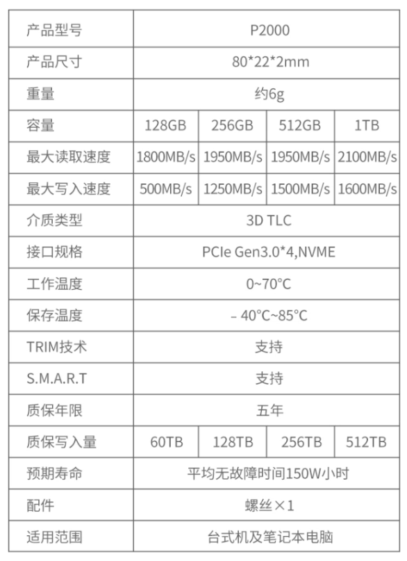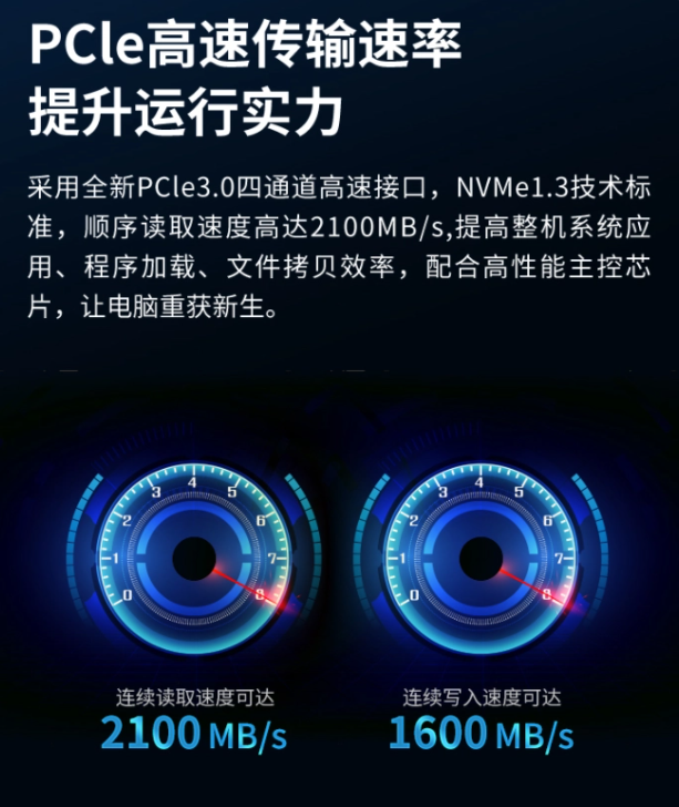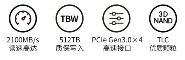 官方宣称:此款采用 3D TLC 颗粒,PCIe 3.0 四通道接口,NVMe1.3 标准,顺序读取速度 2100MB/s、连续写入速度速 1600MB/s。