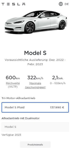 特斯拉官网页面也显示出,Model S Plaid 在欧洲各个市场的预计交付时间从 2022 年 12 月到 2023 年 2 月不等。相比之下,配置较低的 Model S AWD 尚未在欧洲上市。欧洲用户也没法通过特斯拉官网订购 Model S AWD。