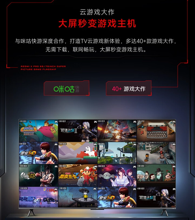 小米 Redmi 游戏电视 X Pro 还与咪咕快游深度合作,支持 TV 云游戏,可玩 40+ 款游戏大作。