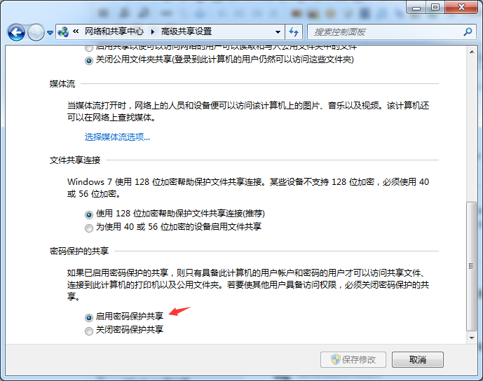 5、在选项中找到密码保护的共享,勾选启用密码保护共享即可。