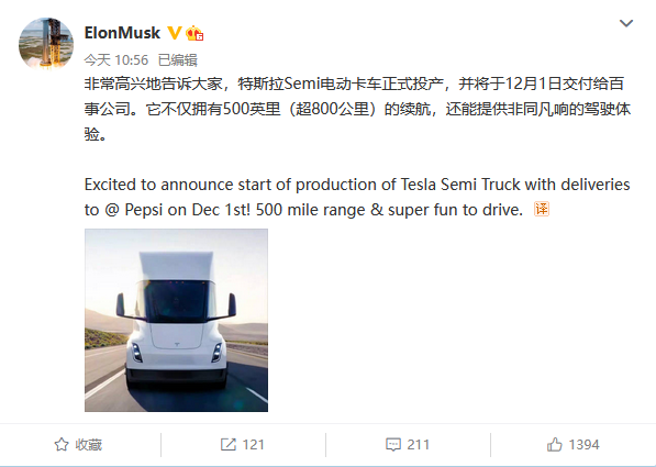 不过就在10月8日消息,特斯拉CEO马斯克发博称:非常高兴地告诉大家,特斯拉Semi电动卡车正式投产,并将于12月1日交付给百事公司。