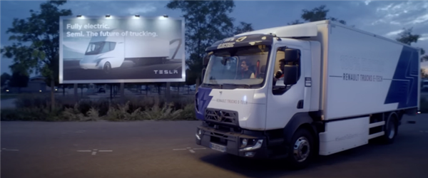 在这则广告中,一工人把特斯拉Semi照片挂在了路边的广告牌上,牌子上写着“全电动,Semi,卡车运输的未来”,然后这名工人回到他停在一旁的电动雷诺纯电卡车上,吹着口哨开走了车子。