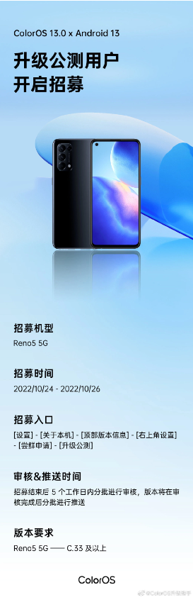 10 月 24 日消息,OPPO 现宣布,骁龙 765G 机型 Reno5 5G 开启 ColorOS 13.0 升级公测版本用户招募。