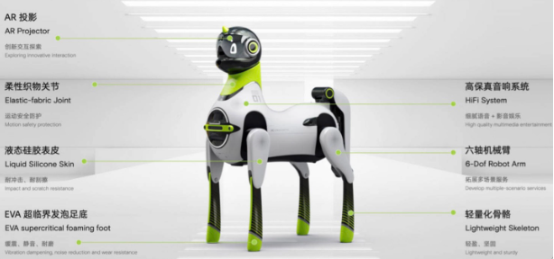小鹏鹏行智能机器人运用了柔性织物关节、液态硅胶表皮、EVA 超临界发泡足底、高保真音响系统、六轴机械臂、轻量化骨骼,并加入了 AR 投影功能。
