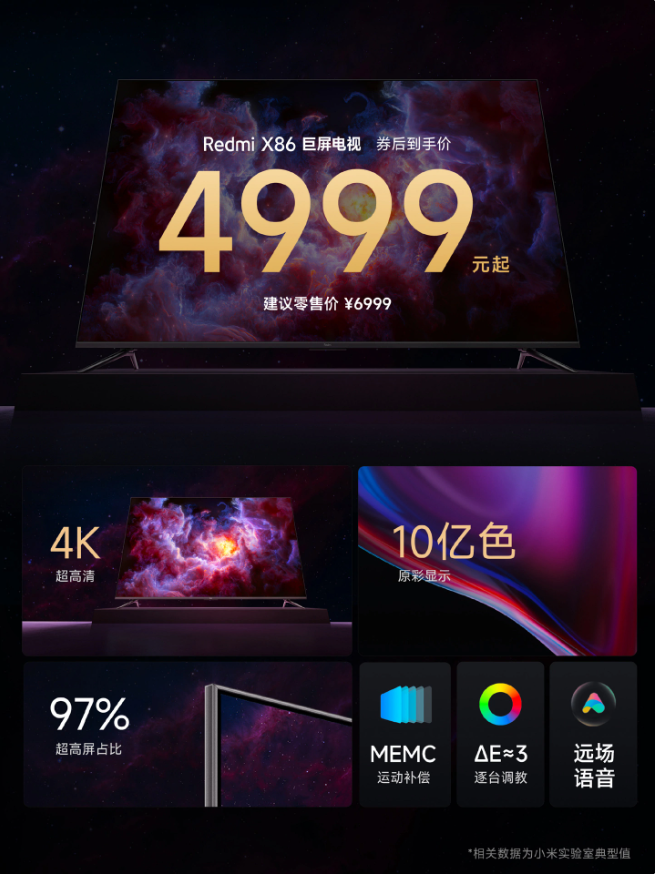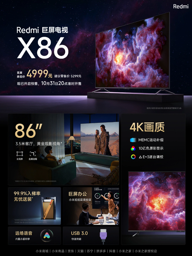 10 月 27 日消息,小米今晚发布了 Redmi X86 巨屏电视,首发价 4999 元。