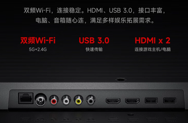 接口方面,该电视配备 USB 3.0、USB 2.0、2*HDMI 2.0 接口,支持双频 Wi-Fi。