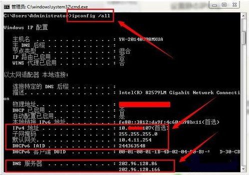 如果你的是动态IP地址,在运行输入’cmd‘命令【ipconfig/all】查看IP基本信息,最后填写在协议版本四中。