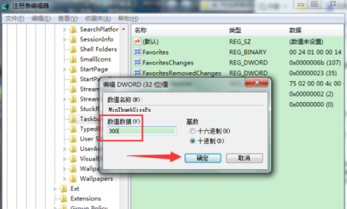 4,然后双击这个文件,将“基数”选为“十进制”,然后数值这里就是根据大家的需要来填写了,你写300,win7预览窗口大小便是300。