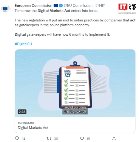 10 月 31 日消息,据央视新闻报道,欧盟今年 3 月制定的旨在规范大型互联网平台公司运营的《数字市场法》(Digital Markets Act)将于当地时间 11 月 1 日起生效。