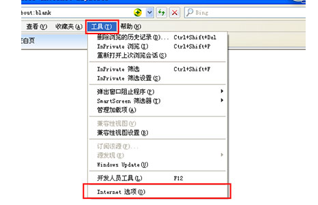第二步:选择IE 菜单栏----工具菜单----Internet选项