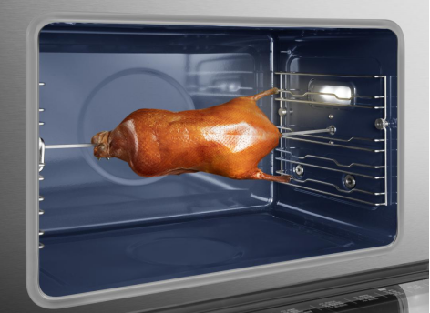 “烤”:该款集成灶蒸烤箱一体机复刻了古法的悬烤工艺,在腔体内装置有可360°旋转的烤叉,可以让需要烤制的食物受热均匀,再加上腔内三面分布的5根烤管和钛合金加热风扇一起工作,利用风扇带动烤箱空气流动,实现的温度均衡,让整个腔内受热更加均匀,工作时内腔最高温度可达到230℃,特别适合大块肉类的烤制,比如整鸡、羊腿等等。