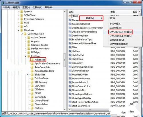 定位到指定项“HKEY_CURRENT_USERSoftwareMicrosoftWindowsCurrentVersionExplorerAdvanced”在“Advanced”项目内新建一个“DWORD(32-位)值(D)”。