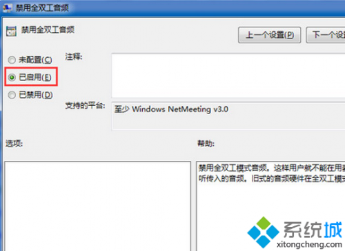 3、在打开的禁用全双工音频设置窗口中,选择“已启用”即可。