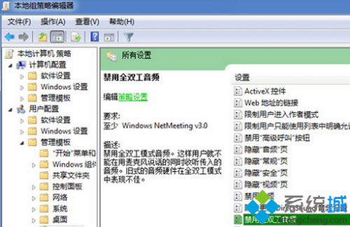 2、在本地组策略编辑器中,依次展开“用户配置——管理模板——所有设置”,在右侧窗格中找到并双击“禁用全双工音频”的选项;