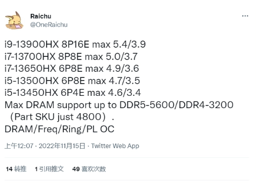 IT之家了解到,他还透露了此前从未出现的酷睿 i7-13650HX(14 核)、i5-13500HX(14 核)和 i5-13450HX(10 核)型号的规格: