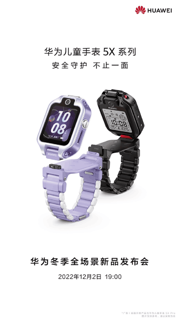 通过预热海报,可以看出华为儿童手表5X系列在设计上延续了上几代产品的设计理念,采用了前后双屏可翻转、可摘取设计,由一块彩色屏幕+一块电子码表风格屏幕的双屏组合而成。