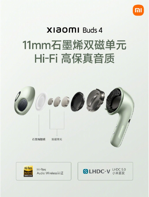 小米 Buds 4 采用了“天使环”设计,搭载石墨烯双磁发声单元,支持动态自适应 EQ 补偿(需安卓 6.0 及以上手机),首发 LHDC 5.0 传输协议,拥有 Hi-Res Audio Wireless 认证。
