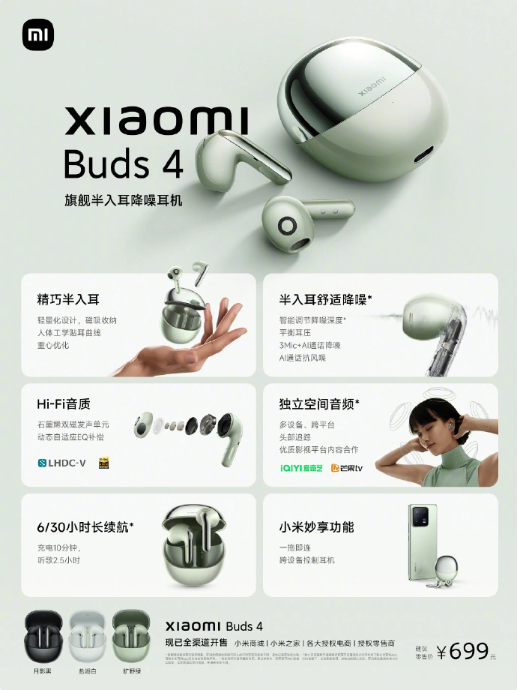 699 元,小米 Buds 4 半入耳式降噪耳机发布:首发 LHDC 5.0 协议,支持空间音频