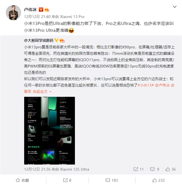 太强了!卢伟冰称小米13 Pro应该叫“小米13 Pro Ultra”