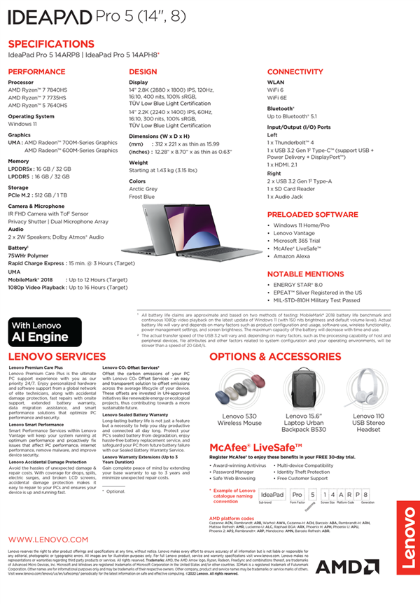 其中,IdeaPad Pro 5 14处理器可选AMD Ryzen 5 7640HS, Ryzen 7 7735HS和Ryzen 7 7840HS,由于AMD尚未正式发布,详细规格有待揭晓,包括CPU/GPU架构信息、主频和核心数量等。