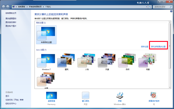 3、另外还可以点击【联机获取更多主题】,在网络上获取壁纸图片