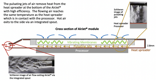 这种芯片采用“固态散热解决方案”,芯片内部为微小的膜,这些膜产生强大的气流,通过顶部的通风口进入芯片,并从一个单独的通风口带走热量。