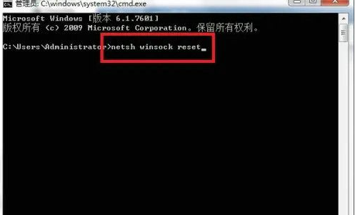 2、在命令提示符下输入netsh winsock reset(按回车即可执行命令);