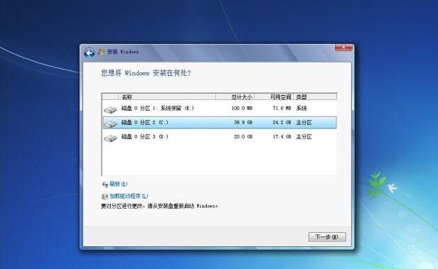 6、下面就到系统分区界面,这里直接选择【C盘】,再点击【下一步】