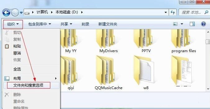3、设置好后点击界面左上角的【组织】选项,点击下拉菜单中的【文件夹和搜索选项】