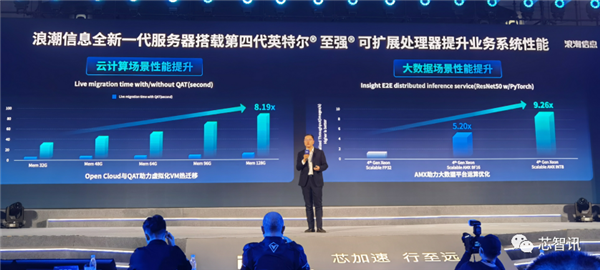 浪潮信息服务器产品部总经理赵帅表示,搭载第四代Intel可扩展处理器的浪潮信息全新一代服务器,在Open Cloud与IntelQAT助力下,云计算场景(虚拟化VM热迁移)性能最高提升到了8.19倍;在IntelAMX助力下,大数据场景性能最高提升到了9.26倍。
