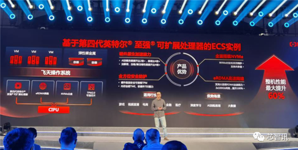 阿里云智能服务器首席架构师刘礼寅表示,阿里云基于第四代Intel至强可扩展处理器的ECS实例的整机性能相比上代最大提升了60%,数据库读写性能提升15%,加解密/压缩解压缩性能提升了4倍,AI性能提升了4倍。