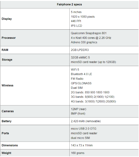 IT之家了解到,在配置规格上,Fairphone 2 手机搭载骁龙 801 芯片,采用 5 英寸的 1920x1080 分辨率 IPS LCD 屏幕,搭载 2GB LPDDR3 内存,32GB eMMC 5 存储,前置 8MP 相机,后置 12MP 相机,内置可拆卸的 2420mAh 电池,采用 USB 2.0 端口,机身尺寸为 143x73x11mm,重量 168 克。