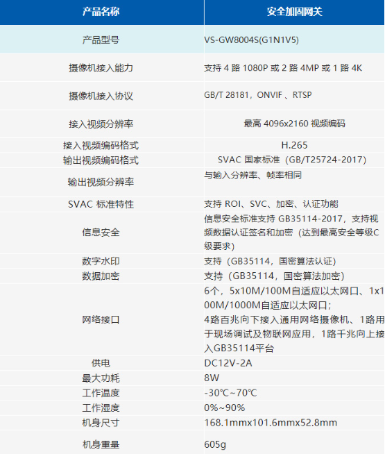 VS-GW8004S(G1N1V5)严格按照《GB/T25724-2017 公共安全视频监控数字视音频编解码技术要求》(简称SVAC国家标准)的视音频编码要求精心设计,不仅支持绝对时间、智能分析报警、OSD 等监控专用信息,还支持前端视频结构化描述信息,为产品符合安全国标打下技术基础。另外,VS-GW8004S(G1N1V5)产品还严格按照《GB35114-2017 公共安全视频监控联网信息安全技术要求》(简称安全国标)的最高要求进行设计,技术上不仅支持SVAC2视频编码、还支持国密算法加密和认证签名、数字证书管理,实现了数据防泄露防篡改、信源可信,保证了监控数据的保密性、真实性和完整性,完全满足国标最高安全等级 C 级的要求。用户使用该产品,由C级安全标准护航,再不用担心网络监控被篡改,同时,也不用担心监控数据会丢失和不完整,让用户网络摄像监控系统真正实现安全加固。