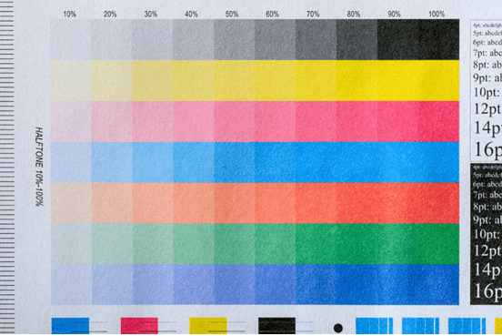 从相机翻拍的MFC-J3940DW打印的Imagexpert模板来看,打印效果不错,每一格之间的色彩过渡较为自然,没有出现明显的色阶,但受限于4色墨盒,色彩表现一般。